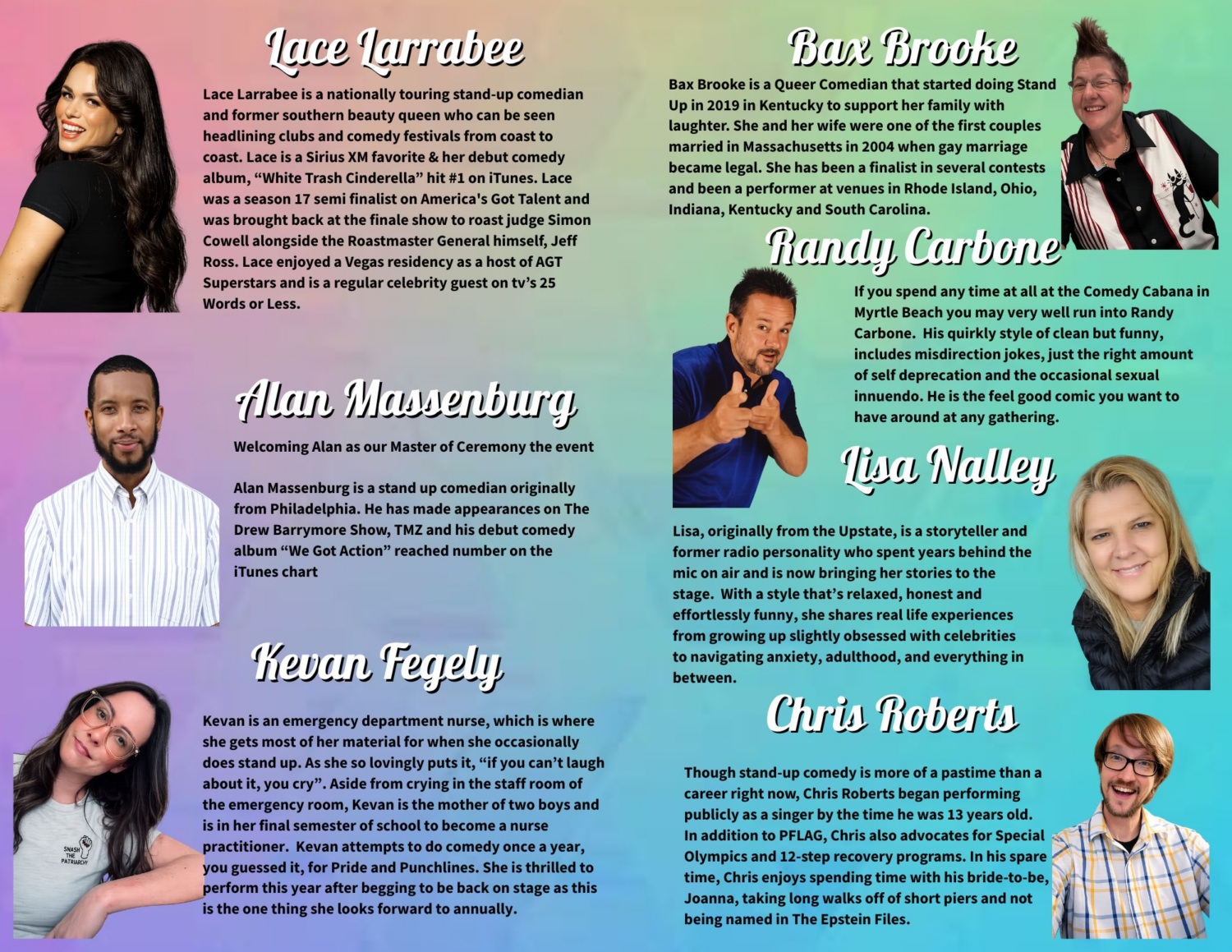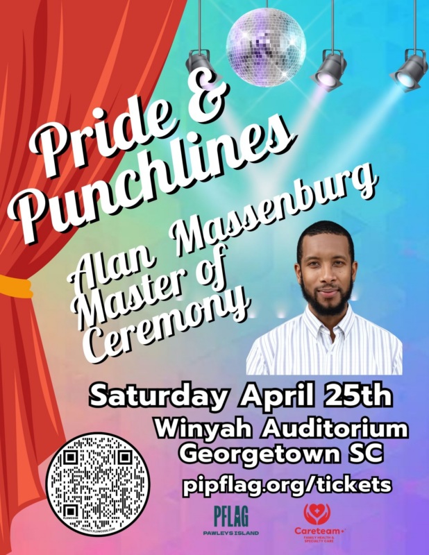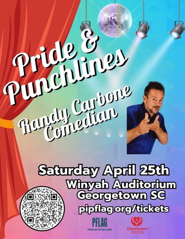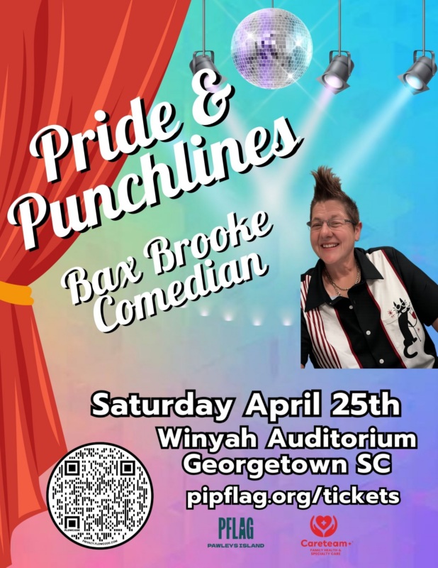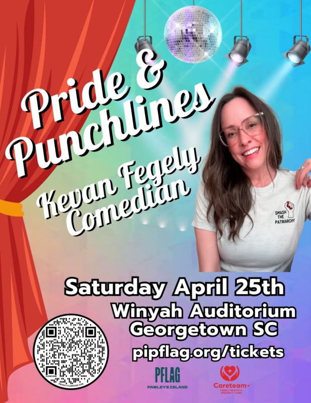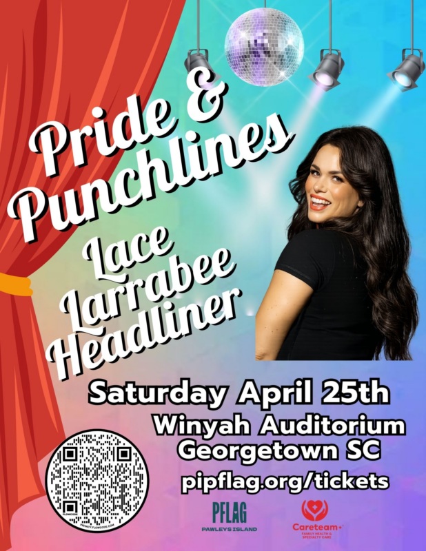 The evening features a lineup of local and regional comedians, leading up to Lace’s headline set, all in support of PFLAG Pawleys Island. Proceeds from this event directly support our expanding family and youth programs, along with education, outreach, and community-building efforts across Georgetown County.